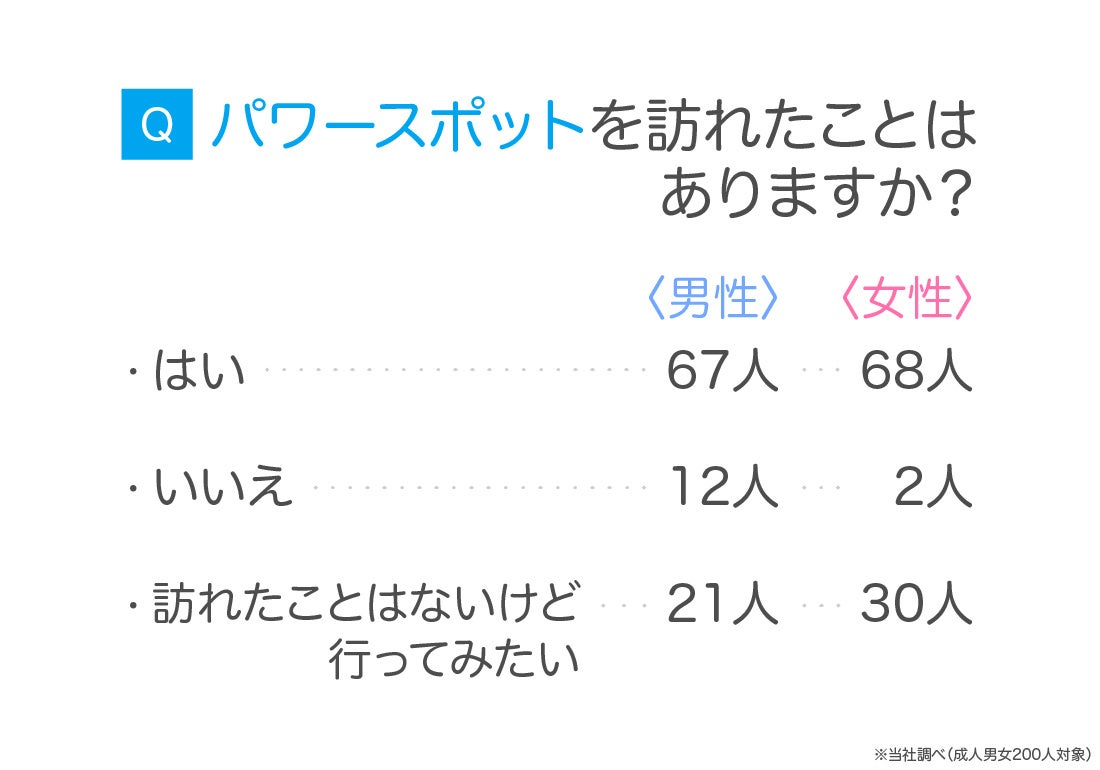 「訪れたことはないけど行ってみたい」と回答した人も2割強いることから、9割以上の人がパワースポットに興味があるということになります。