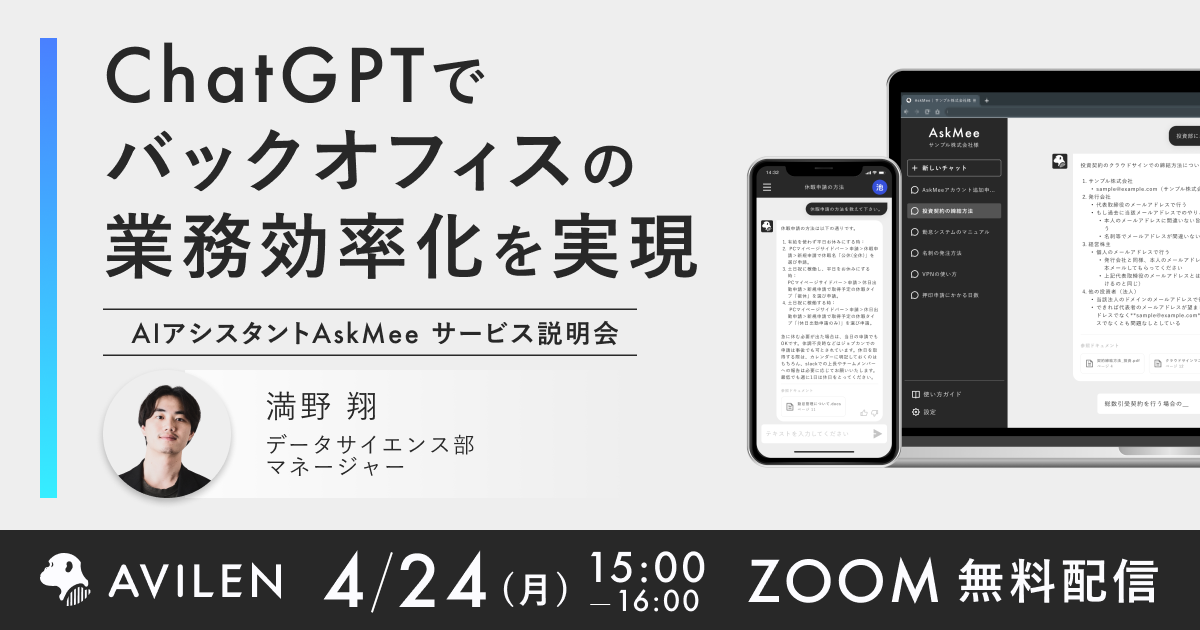 サービスの提供開始と合わせて、AIアシスタント「AskMee」のサービス概要とバックオフィス業務におけるChatGPTの活用事例を解説するウェビナーを開催いたします。ご興味のある方はぜひ下記URLからお申し込みの上、ご参加ください。
