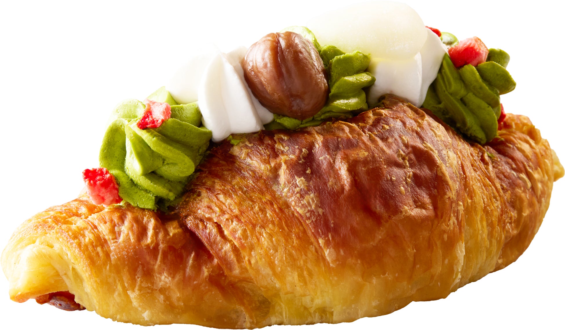 国産有機抹茶を使った香り高いなめらかな植物由来クリーム※1が上品な味わいのクロワッサンサンド。ごろごろとした栗ともちっと食感の求肥を贅沢トッピング。味わい深い抹茶に多彩な食感もプラスし、ストロベリーフレークと糖漬オレンジを加えて、食べ進めるたびに異なる食感と味わいの変化を楽しめます。抹茶のほろ苦さと甘さが絶妙に調和した、和の味わいです。