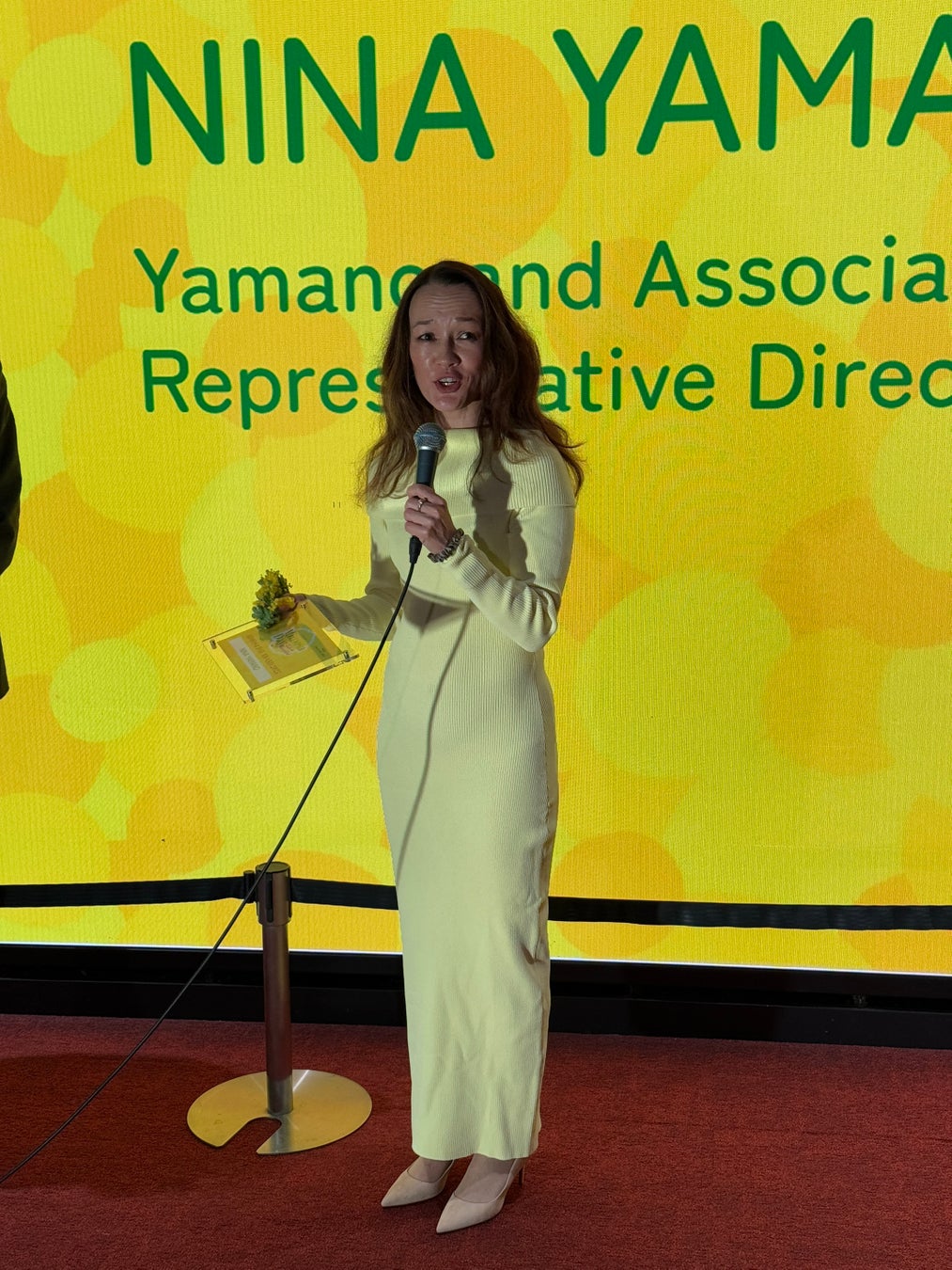 「この度はミモザアワードこのような賞をいただき、とても光栄に思います。わたしだけではなく、全ての女性のエンパワーメントを応援する方々への賛辞であると感じています。日産自動車ではダイバーシティを経営戦略に掲げてから約20年間の間に、女性のマネージャー比率は、約7倍に増加しました。ダイバーシティ推進オフィス『ダイバーシティディベロップメントオフィス』では次世代の女性のマネージャー育成を担っています。また、イタリアのミモザデーにちなみ、夫にミモザの花を購入してもらいました。そして今夜はイタリアの文化を深く感じながら、美味しいイタリア料理を満喫しようと思います。」というすてきなビデオメッセージをいただきました。