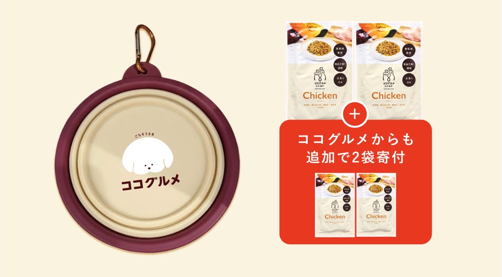 ココグルメチャリティーフードボウルとココグルメ・レトルトを2袋・4袋・6袋から選択し購入いただきます。ご購入いただいた数に応じて、当社が購入数と同じ数をプラスし、保護犬の元に届きます。
