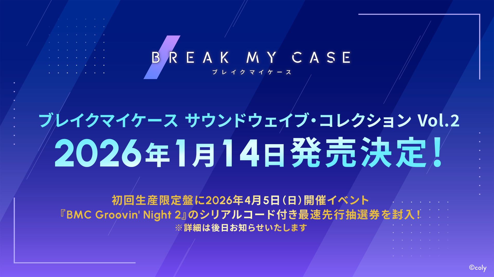 株式会社coly(所在地:東京都港区、代表取締役社長:中島杏奈)は、スマートフォン向けゲーム『ブレイクマイケース』(以下、ブレマイ)のDJイベント『BMC Groovin' Night2』の開催を発表いたしました。また、ゲームアプリ内で使用しているパズルBGMを収録したアルバムCDの第2弾『ブレイクマイケース サウンドウェイブ・コレクション Vol.2』の発売や、来年2月開催のイベント『ブレイクマイケース 3rd Conference』の続報などもあわせて公開しております。