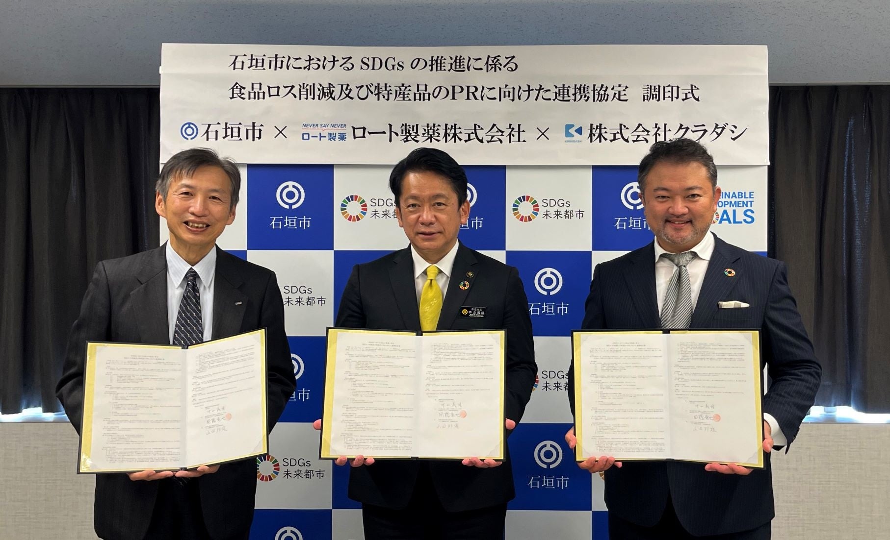 ロート製薬株式会社(本社:大阪府大阪市、代表取締役社長:杉本雅史)は、沖縄県石垣市(市長:中山義隆)と株式会社クラダシ(本社:東京都品川区、代表取締役社長CEO:関藤竜也)の3者で「石垣市におけるSDGsの推進に係る食品ロス削減及び特産品のPRに向けた連携協定」を締結いたしました。今回の協定にて、一社では解決することが困難な社会課題に取り組み、人も地域も健康になる社会へと貢献していきます。