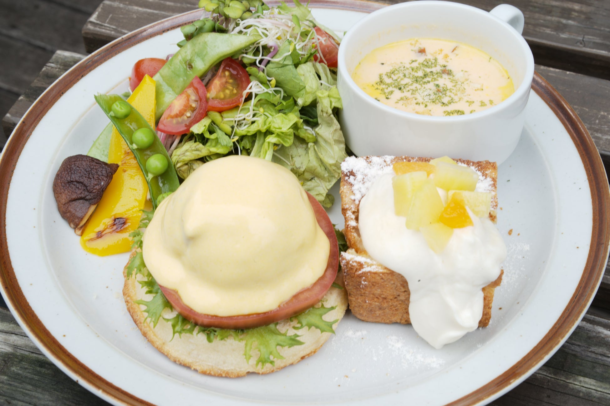 卵不使用とは思えない濃厚なソースが特徴のベジベネディクトを中心に、フレンチトースト・本日のスープ・ガーデンサラダが1皿で味わえる4周年の特別メニューです。