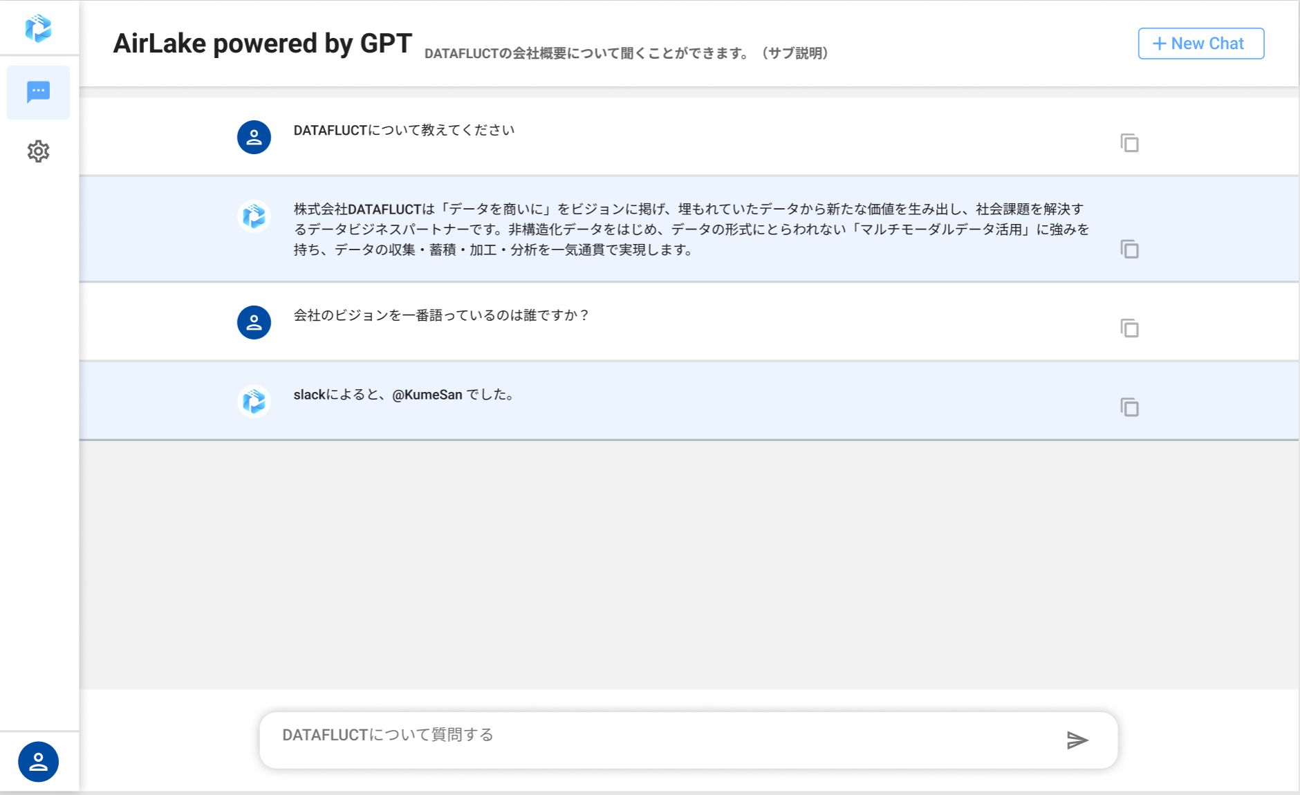 また、開発中の最新サービスとして、DATAFLUCTの「AirLake」とOpenAIの「Chat GPT」を組み合わせた社内データ分析サービスも展示予定です。DATAFLUCTに関する公開済データ・社内データをもとに『今週は社内でポジティブな発言がどれくらいあった?』などの直感的な質問で、情報を把握できるサービスを体験いただけます。