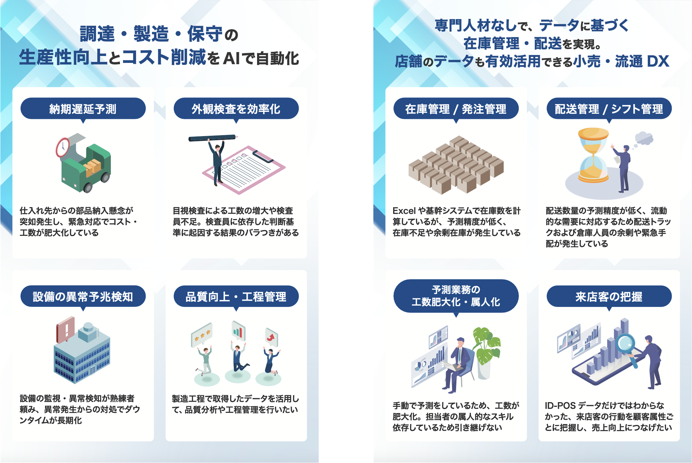 最新のAI/機械学習の技術を、業務利用するためのアイデアを業界別にご提案します