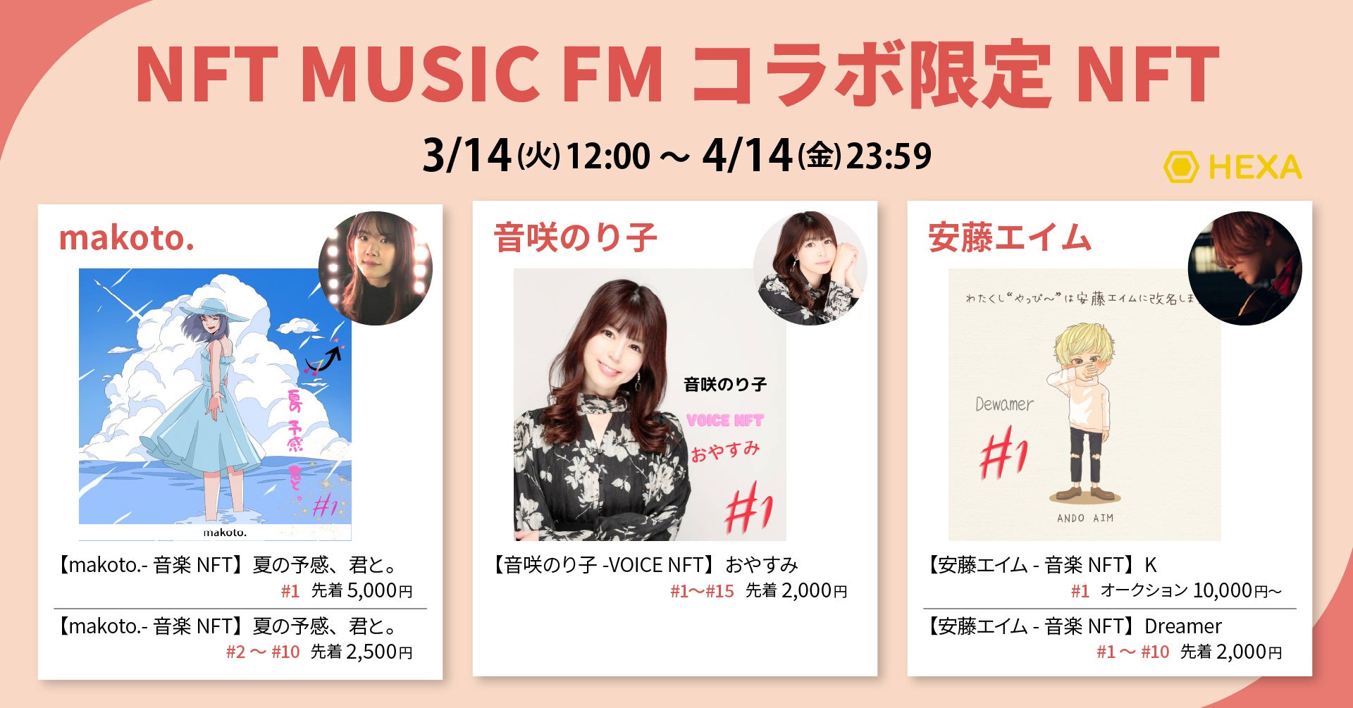 NFTマーケットのHEXA(ヘキサ)では、「makoto.」、「音咲のり子」、「安藤エイム」による「NFT MUSIC FM」との限定コラボ音楽NFTが3/14(火)12時から販売されます。