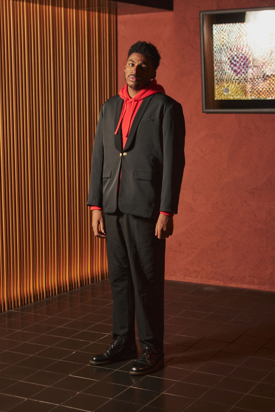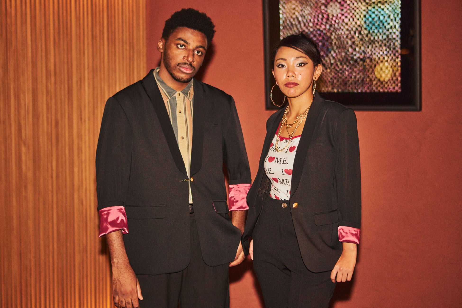 黒のジャケットでありながらラグジュアリー感が出るように、襟元にはサテンの生地を使用。フロントボタンは取り外し可能なチェーン式を採用し、遊び心を取り入れました。