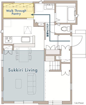 また、キッチンの奥に設けたウォークスルーパントリーは、LDKで使うものや、生活用品のストックを一か所にまとめて収納できます。物を戻す場所がわかりやすく、片付けの手間を減らせます。