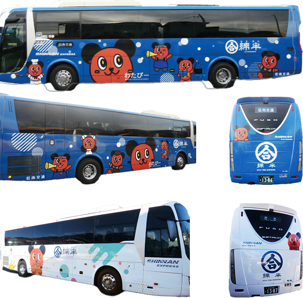 現在、「長野⇔池袋」・「飯田⇔新宿」・「河口湖⇔新宿」で当社グループのラッピングバスが3台運行していますが、長野県内外へ店舗網が広がる中、より多くのお客さまに当社グループのことを知っていただくため、綿半創業の地である長野県飯田市と、東京都・愛知県をつなぐ高速バスにラッピング広告を施しました。