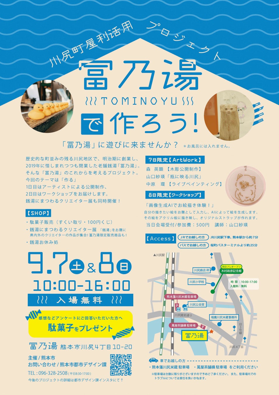 熊本市(市長:大西 一史)は、令和6年(2024年)9月7日(土)、9月8日(日)に、現在休業中の銭湯「冨乃湯」を対象とした、第1回実証実験イベント「川尻町屋利活用プロジェクト 冨乃湯で作ろう!」を開催することをお知らせします。
