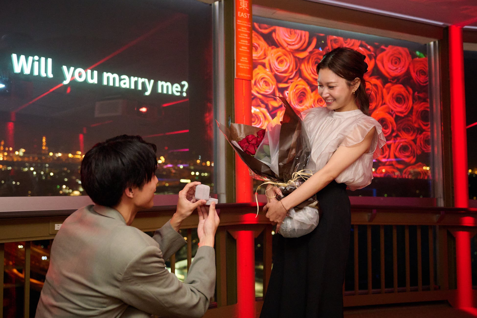横浜港の景色を代表する施設のひとつ、「横浜マリンタワー」の展望フロアを閉館後に特別に貸し切り、横浜が誇る美しい夜景を“ふたりじめ”できるプロポーズプランです。夜景を眺めながら、大切な人との思い出の写真とともに愛のメッセージを伝えることができる花のオリジナル動画もご用意。プロポーズの際には、展望フロアのガラスに投影いただけます。今後、同じ山下町エリアに立地する「ザ・ゲートホテル横浜by HULIC」で、宿泊とのセットプランも販売予定です。