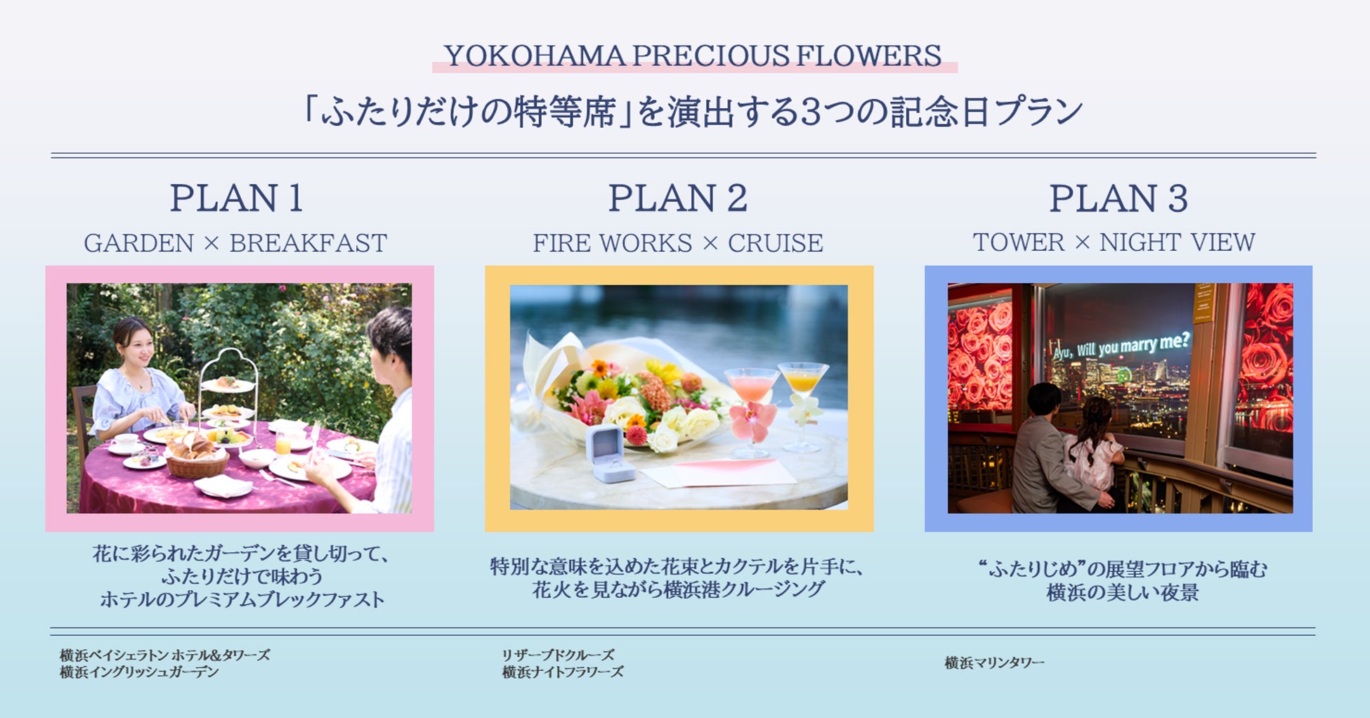 横浜の魅力的な観光資源を活用し、ふたりだけの空間としてお楽しみいただける特別な記念日プランです。季節の花が咲き誇る庭園で朝食を楽しめるプランをはじめ、船から花火を見ながら横浜港を周遊できるクルージング、そして横浜の華やかな夜景を展望台で“ふたりじめ”できる3つのプランをご用意しています。美しい花が溢れる港街・横浜らしい“花”をテーマにし、幸せな一歩を踏み出すプロポーズや大切な人と迎える特別な記念日を演出します。