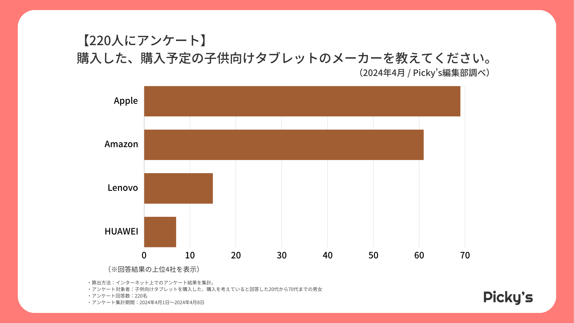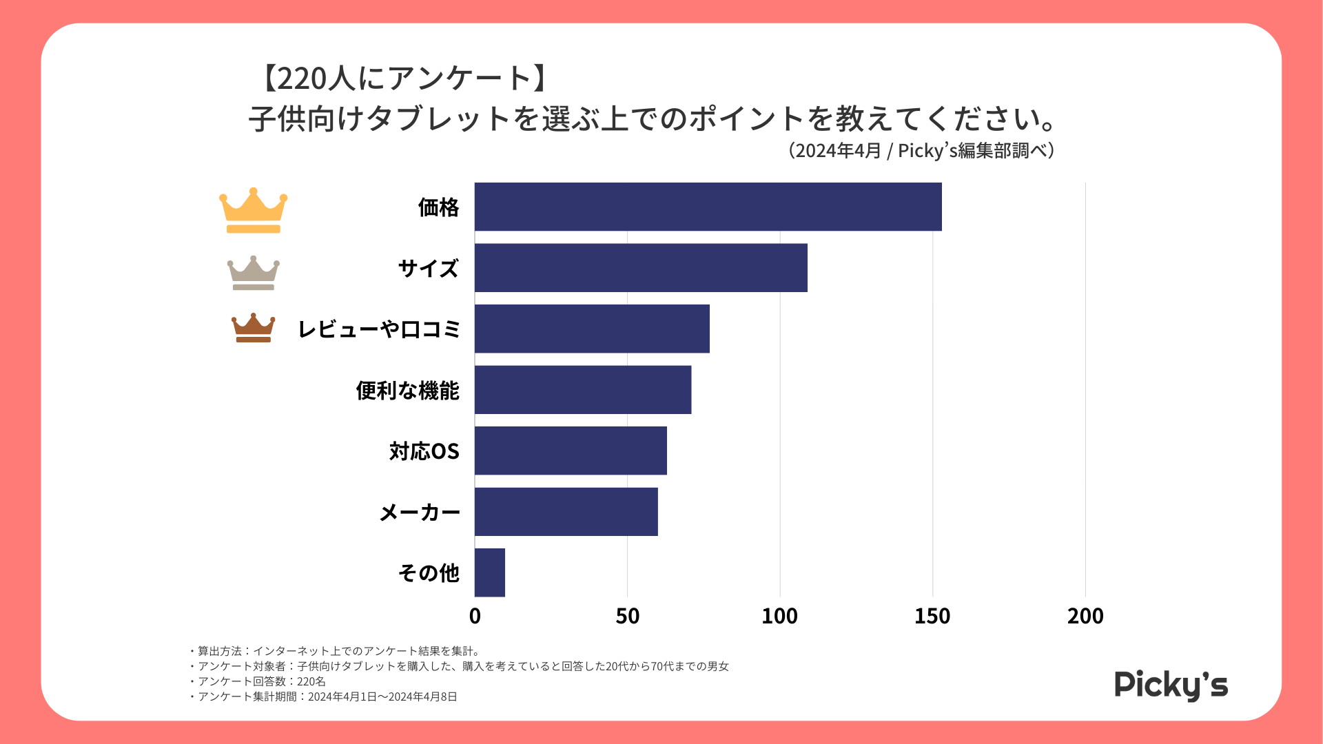 「Picky’s」は、インターネットショッピングにおいて、購入前に試せない・選ぶべきものがわからないという課題の解決を目標に、あらゆる商品のおすすめランキングや検証レビューを紹介するサイトです。このたびPicky’s(https://rentry.jp/)では、子供向けタブレットについてインターネット上でアンケート調査を行いましたので発表いたします。