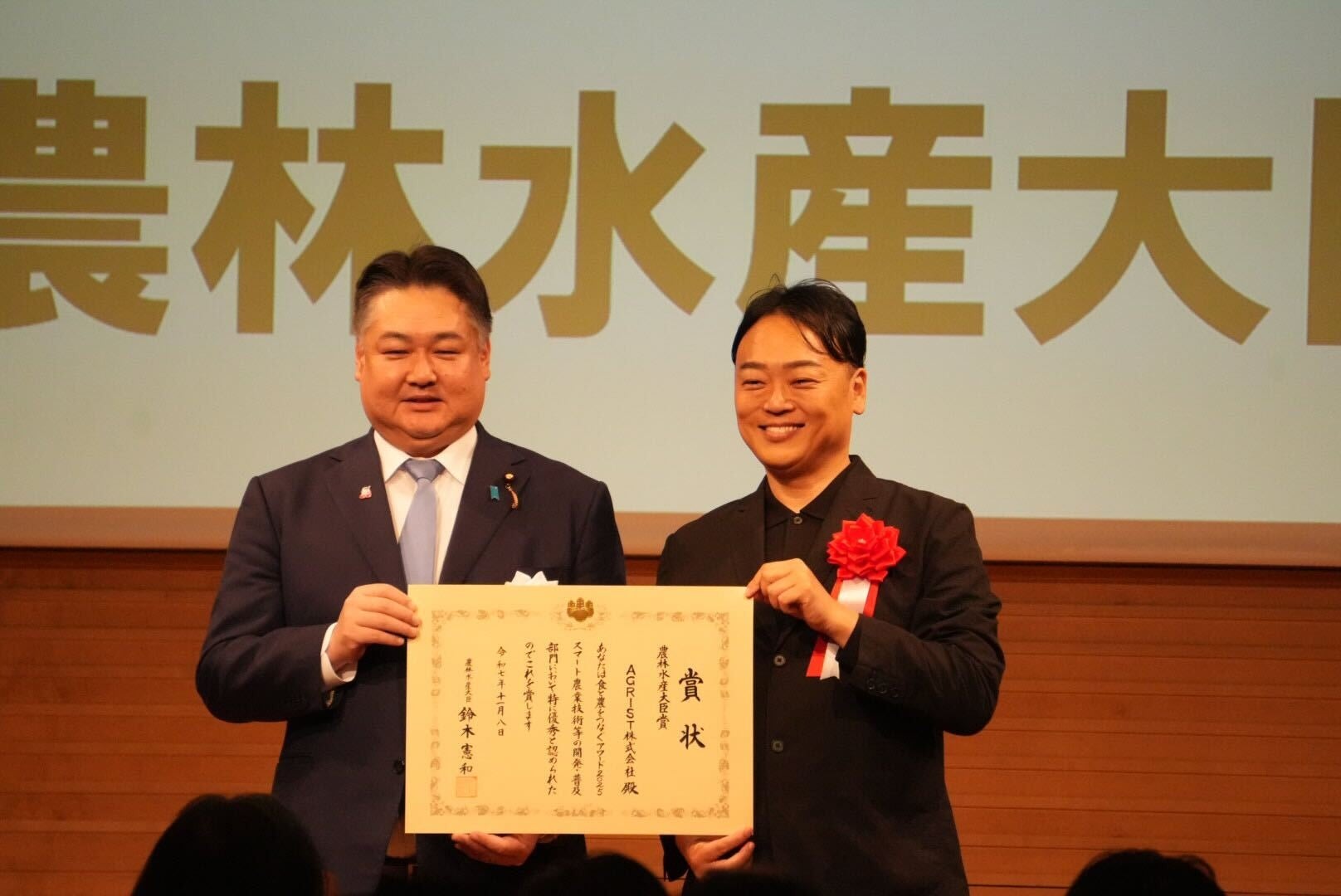 農業課題をディープテックで解決するAGRIST株式会社(本社:宮崎県新富町、以下「AGRIST」)は、農林水産省が推進するニッポンフードシフト表彰事業、第1回「食と農をつなぐアワード」のスマート農業技術等の開発・普及部門において、最高賞である農林水産大臣賞を受賞しました。11月8日(土)に表彰式を実施しました。