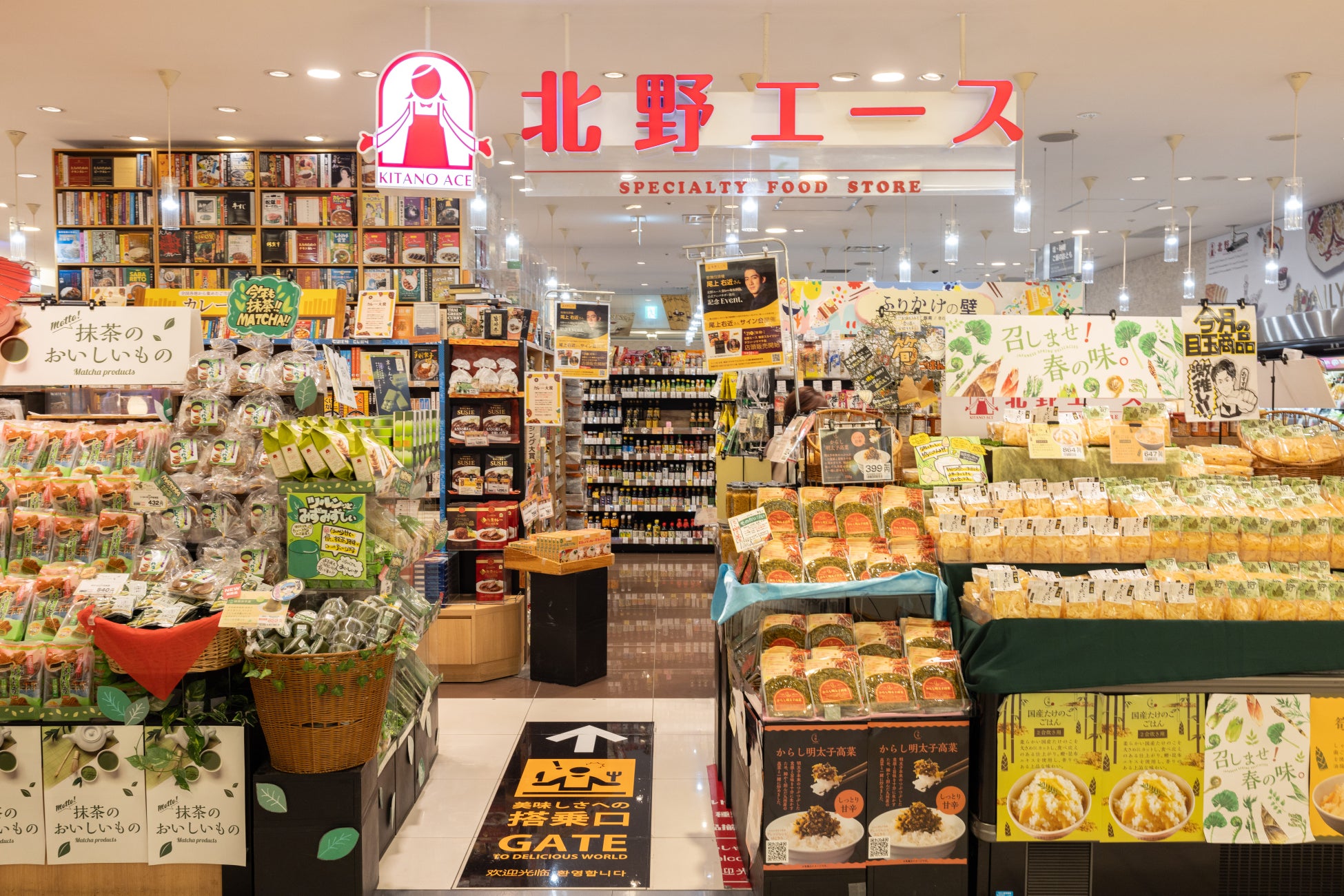 北野エースは、日本全国に100店舗以上を展開する、こだわりの食品を取り扱う食料品専門店です。全国各地や世界中から厳選された名産品、調味料やお菓子、レトルト食品、お酒など幅広い商品を取り揃えています。近年では、海外からのお客様も増加傾向にあります。