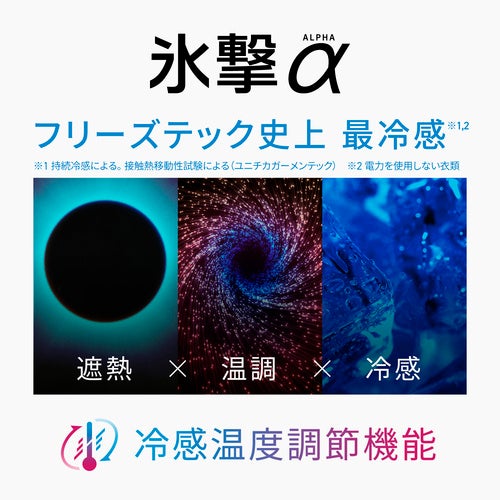 この違いは、氷撃αのオリジナル生地に備わっている「温度調節機能」と「遮熱機能」によるものです。氷撃αでは、住友化学株式会社が世界で初めて(※)開発した固体ポリマー型温度調節材料「コンフォーマ®️」を用いた繊維と、太陽光を遮る繊維を独自に配合し、編み立てています。