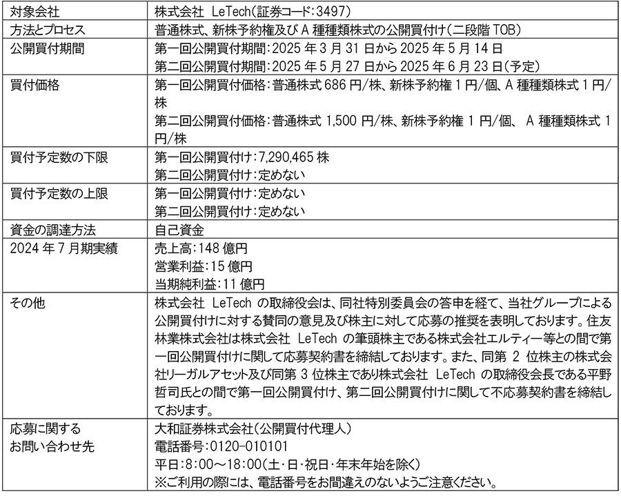 住友林業株式会社(社長:光吉 敏郎 本社:東京都千代田区)は3月28日開催の取締役会で、株式会社LeTech(リテック)(社長:宮地 直紀 本社:大阪府大阪市)の全株式(自己株式を除く)を金融商品取引法による公開買付けにより取得することを決議しました。公開買付けを二回にわたり実施することで、LeTech社の自己株式を除く全ての普通株式※1等を取得し、完全子会社化を目指します。