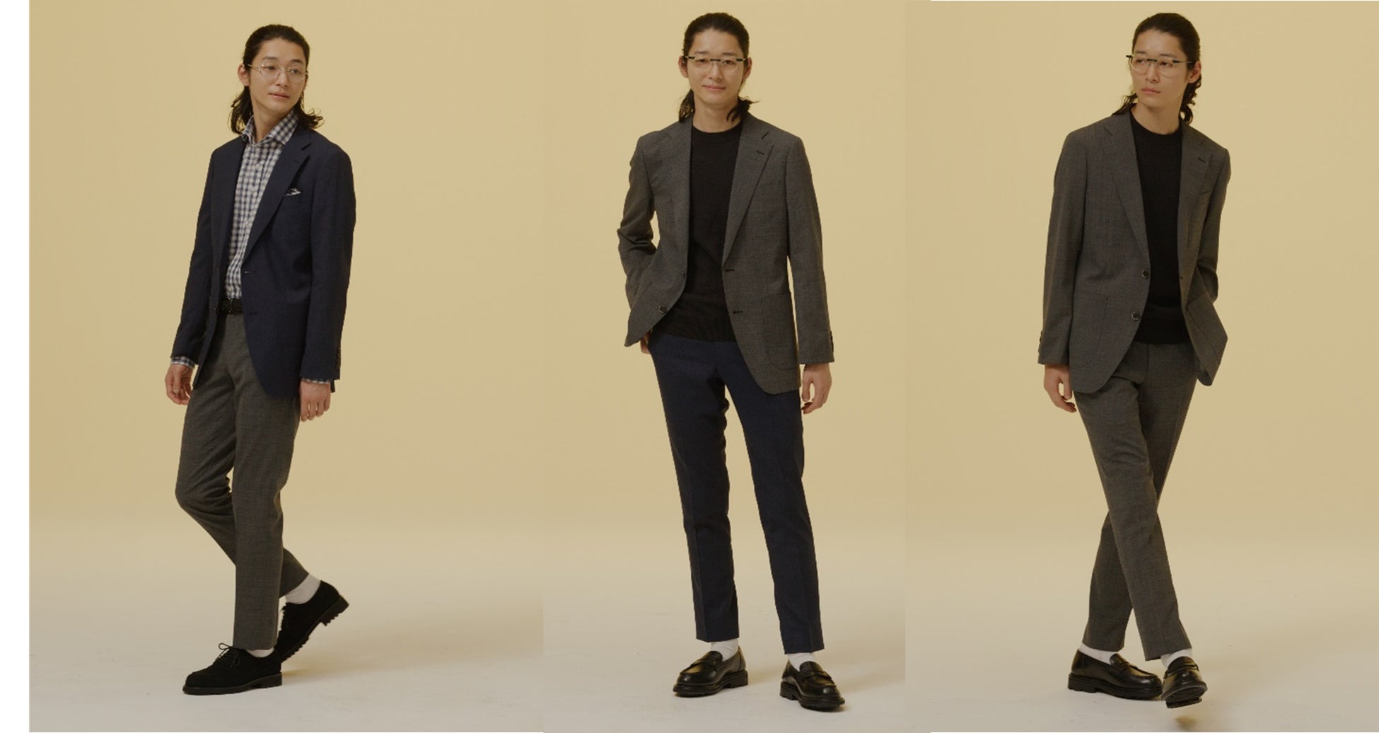 ➢ウール素材を使用した本格的なセットアップにすることで、スーツ本来の着心地や上質感を崩すことなく、適度なカジュアル感を演出しています。