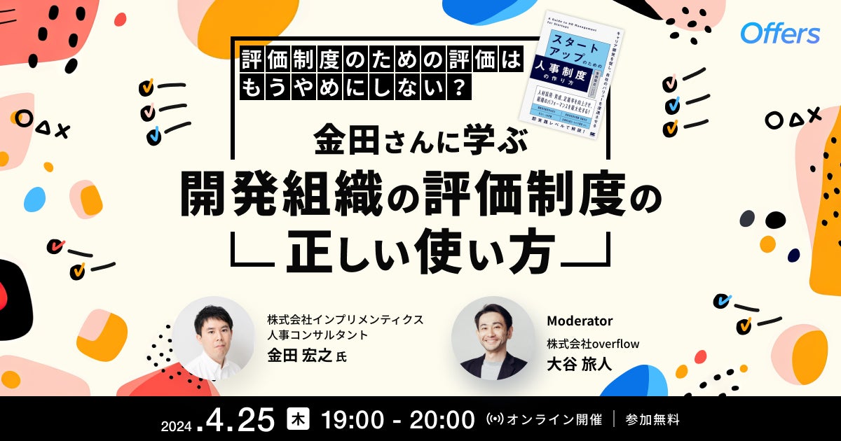 エンジニア、PM、デザイナーの副業・転職サービス「Offers(オファーズ)」を運営する株式会社overflow(本社:東京都港区、代表取締役: 鈴木裕斗・田中慎 以下、overflow)は、2024年4月25日(木)19時から、開発組織に携わる方に向けたイベント「評価制度のための評価はもうやめにしない?金田さんに学ぶ 開発組織の評価制度の正しい使い方」を開催することをお知らせします。