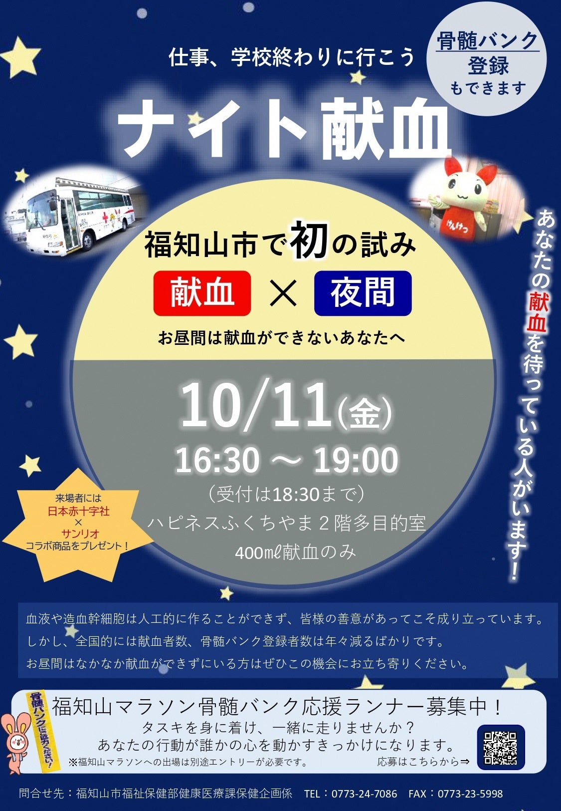 10月は「骨髄バンク推進月間」であり、骨髄移植などに関する正しい理解の啓発やドナー登録を推進するため、全国的に様々なアクションが展開されます。京都府福知山市は、骨髄移植経験者などの体験談を通して理解を深める講演会や、市内初開催となる、夜に行う献血イベント「ナイト献血」を10月11日(金)に行います。