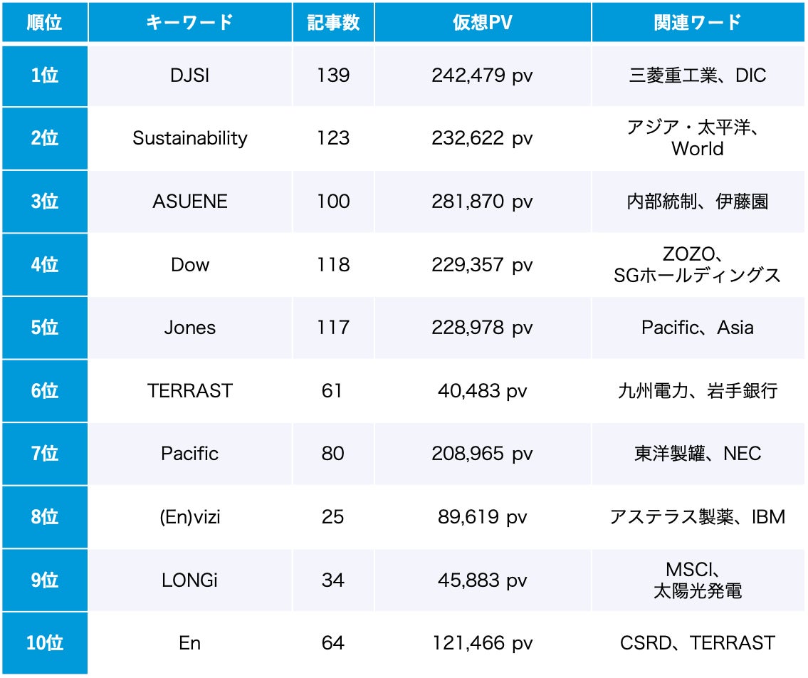 ランキングの大部分を占めたのが「DJSI」関連。ESG投資の代表的な株式指数である「Dow Jones Sustainability Indices」の「World Index」およびアジア・太平洋地域の企業で構成される「Asia Pacific Index」に選定された企業の情報です。とくに12月末に情報が集中しました。
