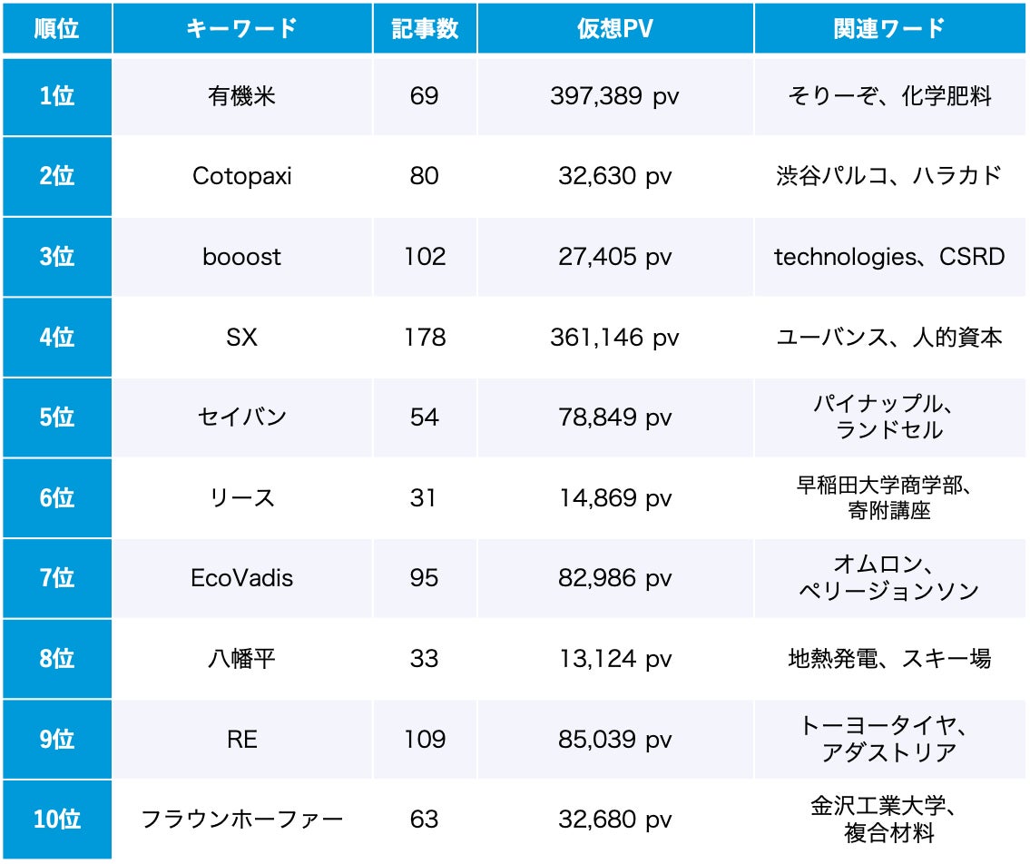 4位は「SX」(サステナビリティ・トランスフォーメーション)。統合型SXプラットフォームを提供しているbooost technologies社のイベント関連の情報発信や、企業のSXを総合的に支援する新会社パソナサステナビリティ設立のプレスリリースによって記事数が多くなっています。