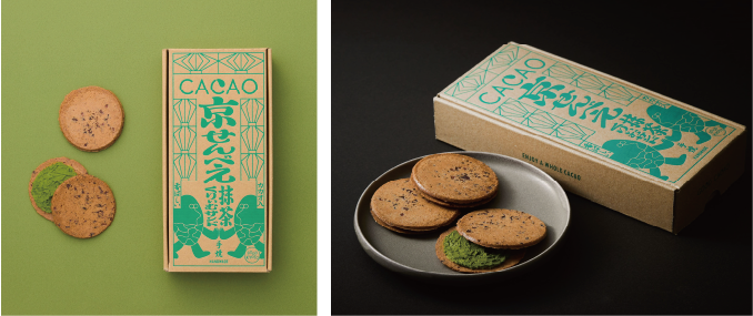 2023年6月にJR京都駅構内の店舗で限定発売された本商品は、発売後7ヶ月で販売個数2,500箱を突破した「カカオ京せんべえ」で京都産抹茶のクリームをサンドした商品で、9月1日(金)からGOOD NATURE STATIONでも販売します。