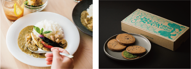 2商品は、いずれもカカオハスクの深みや香りを存分に生かした商品となります。「とろとろ野菜と白味噌の京風仕立てグリーンカレー」は、ココナッツミルクが苦手な方でも食べやすい和テイストに仕上げており、京都産の白味噌に野菜など和の具材を加えたグリーンカレーです。「カカオ京せんべえ 抹茶くりぃむサンド」は、今年6月にJR京都駅構内の店舗限定で先行販売を開始。アップサイクルな京都の新定番土産として好評いただいております。