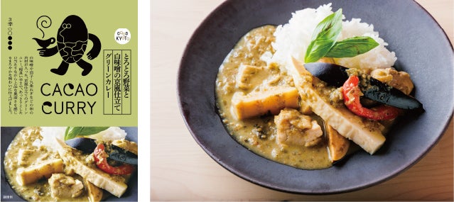 「カカオカレー」シリーズは、素材自体が持つうまみを活かしたカレーです。そこに、通常は廃棄されてしまうカカオハスクを、スパイスの一つとしてカレーにブレンドすることで、新たな価値として再生。素材を余すことなく使用することで食品ロスの軽減にもつながっており、アップサイクルな取り組みも大切な目的の一つとしています。今回は、このシリーズからグリーンカレーが登場。ココナッツミルクが苦手な方でも食べやすい和テイストに仕上げています。ナスや九条ねぎなどの和の具材と国産鶏肉のうまみに、隠し味のほんのりビターなカカオがコク深く絡み合います。そこに野菜のうまみと京都の白味噌「西京味噌」が加わった、上品でまろやかな口当たりが特徴です。野菜とココナッツミルクでとろみづけをしていて、小⻨粉は使用せず、グルテンフリーで仕上げました。