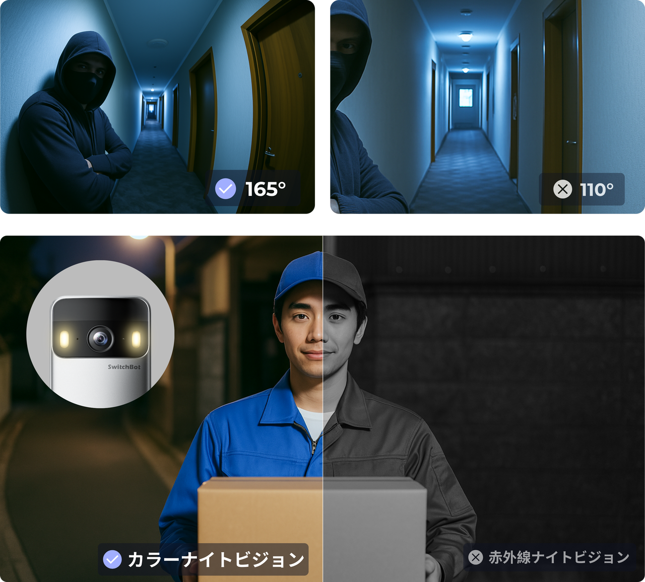 スマホ画面からは300万画素の高解像度で映像が確認でき、来訪者の表情や玄関先の様子までくっきり確認可能。また、165°の広角レンズで、玄関前の広い範囲をカバー。2つのLEDライトを搭載しており、夜間でもフルカラーの映像を映すことができます。