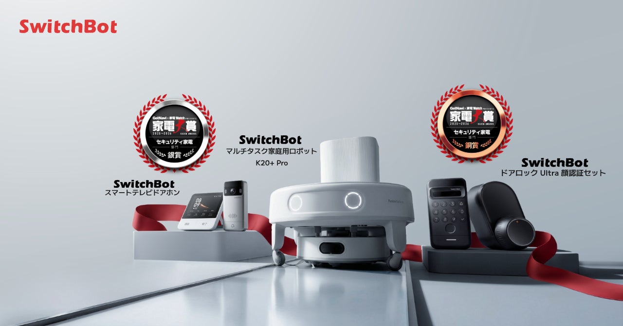 IoT・スマートホーム事業を手掛ける「IoTデバイスNo.1ブランド(※2022年11月 家電Biz調べ )」のSWITCHBOT株式会社(本社 : 東京都渋谷区)は、株式会社ワン・パブリッシング「GetNavi」と、株式会社インプレス「家電 Watch」が共同開催する「家電大賞2025」において、「マルチタスク家庭用ロボット K20+ Pro」がGetNavi賞、「スマートテレビドアホン」がセキュリティ家電 銀賞、「ドアロック Ultra 顔認証セット」がセキュリティ家電 銅賞を受賞したことをお知らせいたします。