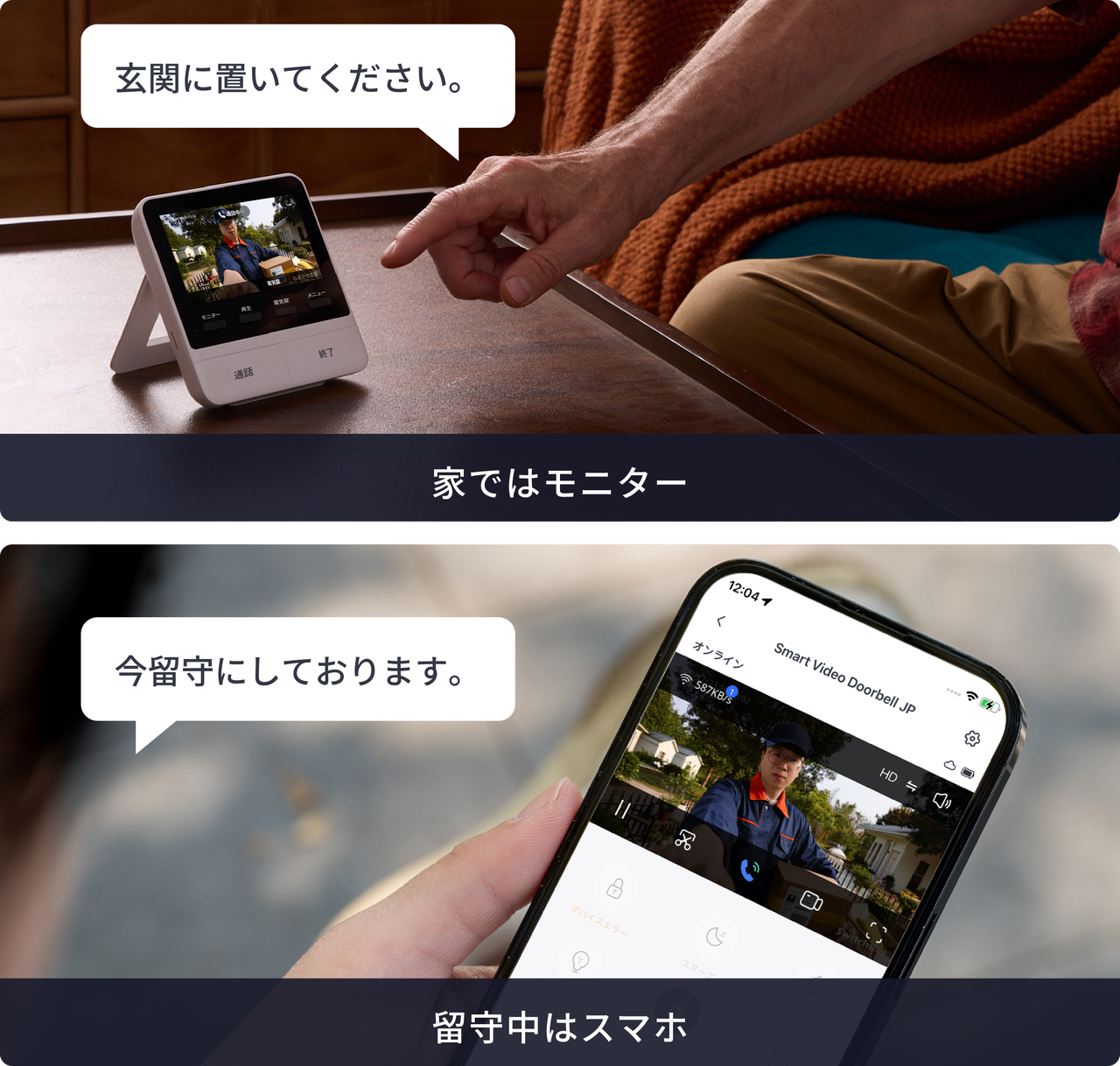家にいるときはモニター親機から、外出中はスマートフォンから、映像確認と双方向通話による来客対応が可能です。宅配便への応対や、留守中の訪問確認など、居場所に縛られず対応ができるため、日常の利便性が大きく向上します。