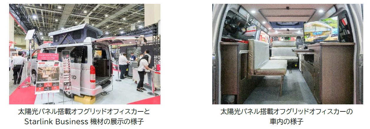 山間部での作業時や高層ビル建設時などの課題であった「インターネットにつながらない」という問題を解決できる、「Starlink Business」機材を展示しました。本サービスは、オンライン会議やビデオ通話など、大容量のデータ転送が必要なシーンでも、高品質なインターネット環境を提供することができます。さらに、災害などによって通信が途切れた場合でも、「Starlink」の衛星ネットワークを活用し、ビジネスの継続や迅速な通信回復を支援することが可能です。使用シーンの一例として、太陽光パネル搭載オフグリッドオフィスカーと組み合わせて展示しました。