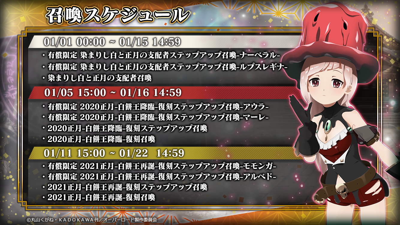 1/1よりイベント『染まりし白と正月の支配者』を開催いたします!イベント連動召喚では『★5【佳麗賀正】ナーベラル』『★5【賀正斉天】ルプスレギナ』が新登場!その他、新召喚『有償限定混沌適応ステップアップ召喚』を実施!新登場『★5【混沌適応:賀正衣】モモンガ』が獲得できるチャンス!