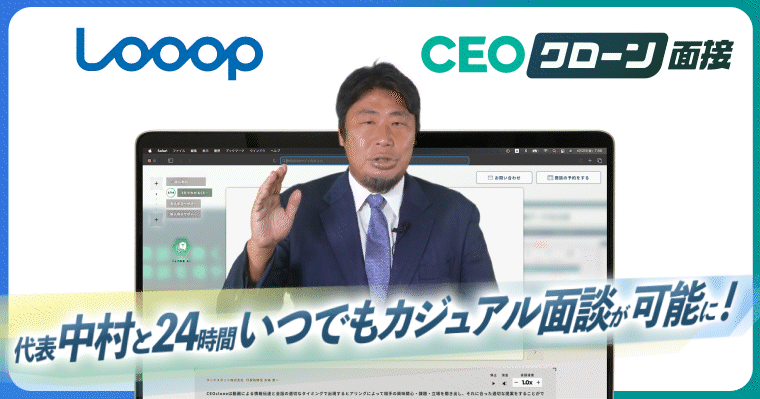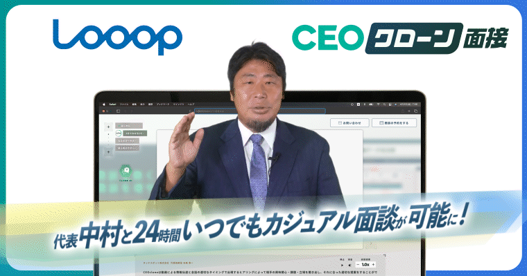 Looopはこの「CEOクローン」を採用領域に活用し、候補者がLooop代表・中村の熱意を感じられるカジュアル面談を24時間いつでも実施できる環境を構築することで、選考の初期段階から相互理解を深めることを目指します。合わせて、人や社会の可能性を広げる新しいエネルギーのあり方を追求するLooopのコンセプトの浸透に期待します。