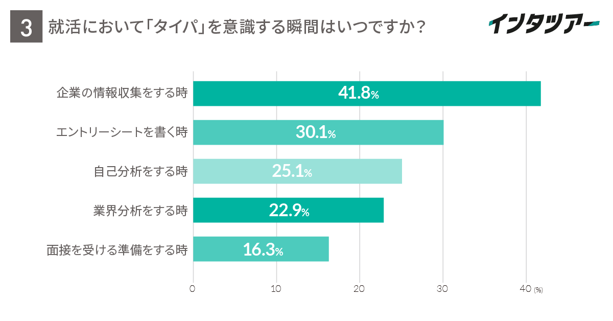 次いで多い回答は「エントリーシートを書くとき」30.1%でした。このエントリーシートの作成も企業単位で必要となるため、効率的に進めることが意識されています。