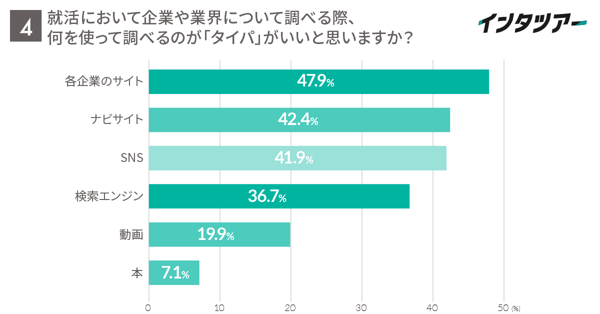 最も回答が多かった選択肢は「各企業のサイト」47.9%でした。次いで「ナビサイト」42.4%、「SNS」41.9%と続きました。