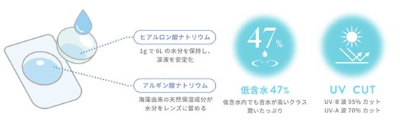 2つ保湿成分をレンズ保存液に配合潤いベールで異物感・乾燥感を軽減。低含水レンズはレンズ自体に必要な水分が少ないため長時間装用やドライアイ気味のかたもおすすめ。肌や瞳に有害といわれ、白内障などの眼病を引き起こす危険性のある紫外線をカットします。