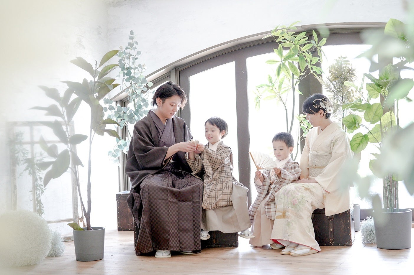 ビンテージとは異なる味わいのコフレオリジナル和装は、節目の撮影で大変人気が高く、ごきょうだいやご家族様のトータルコーディネートのご提案や、お⾐装のレンタルも可能です(※4)。お宮参りの産着レンタルサービスも承っており(※5)、撮影前後1か月の期間であれば無料でご利用いただけます。
