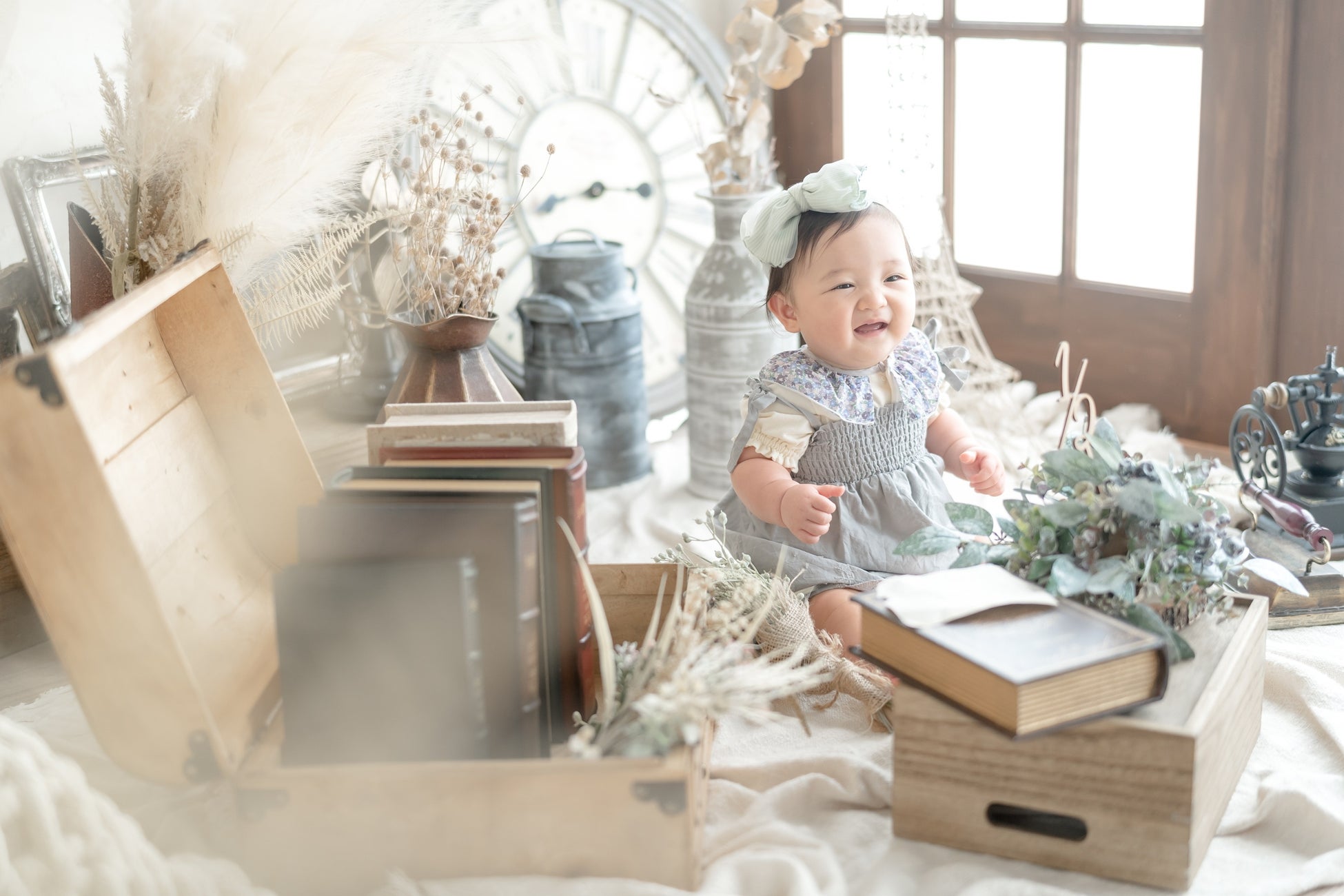 好奇心いっぱいにくるくる変わるお子さまの愛らしい表情を、一瞬たりとも逃さずお写真に仕上げられるよう、どこを切り取っても画になるように計算し尽くされているのが、スタジオコフレの特長の一つ。広島祇園スタジオには夢や自然などワクワクを彩る5つのセットがあり、それぞれに⾊味を統一した「ワントーンフォト(R)」(※3)の世界観が広がります。また千歳飴やバースデーケーキなどの撮影小物も手作りしており、細部まで妥協のないこだわりが独自の世界観を創りあげています。