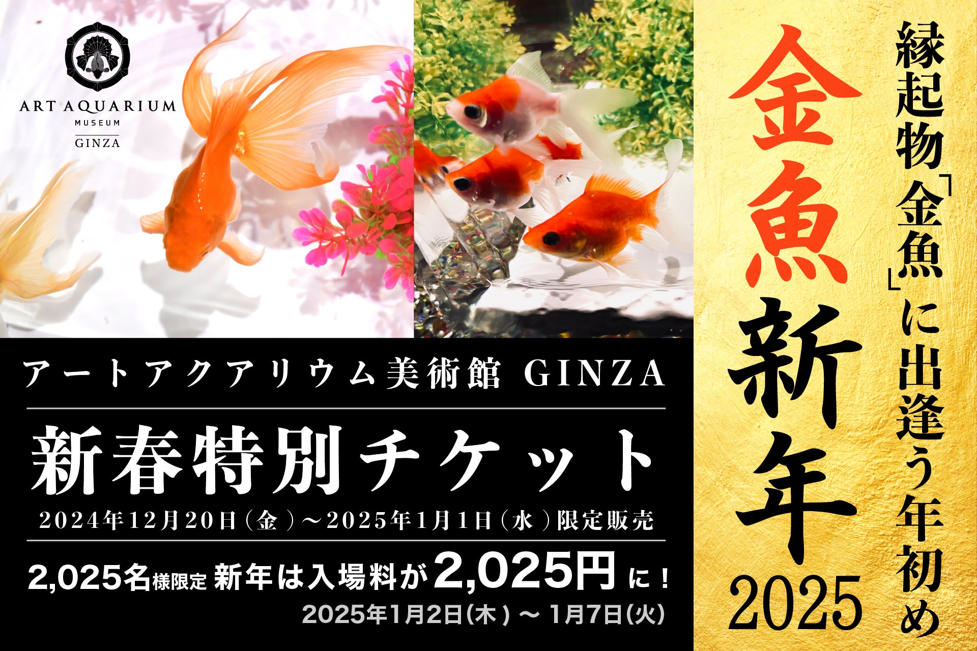 新年のお祝いに、縁起の良い金魚鑑賞を。金魚新年~アートアクアリウム美術館のお正月~新年は2,025名様限定、入場券が開運価格2,025円に!