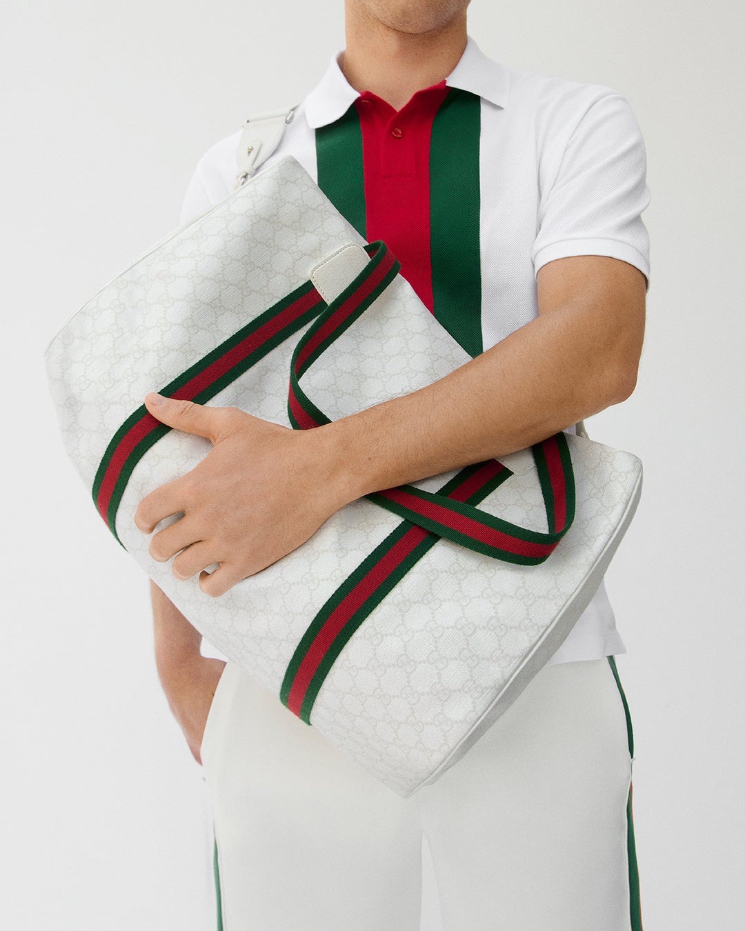 伝統的なテニスウェアをコンテンポラリーなエレガンスで再解釈した本コレクションは、すっきりとしたシンプルなドレス、洗練されたポロシャツをはじめ、ショートパンツまたはスカートをタンクトップやニットウェアと組み合わせて着用できるメンズとウィメンズのセットアップ ウェアを取り揃えています。また、ルックを引き立てるキャップやリストバンド、レザーグッズなどのアクセサリーも展開し、なかでもオールホワイトのGGパターンにウェブ ストライプがアクセントを添える新作のダッフルバッグ、ラケットバックパック、ラケットバッグ、シューズホルダーは注目のアイテムです。さらにアイコニックな〔グッチ テニス 1977〕スニーカーはホワイトのキャンバスとレザーで、〔エース〕スニーカーはGGパターンをまとって登場します。