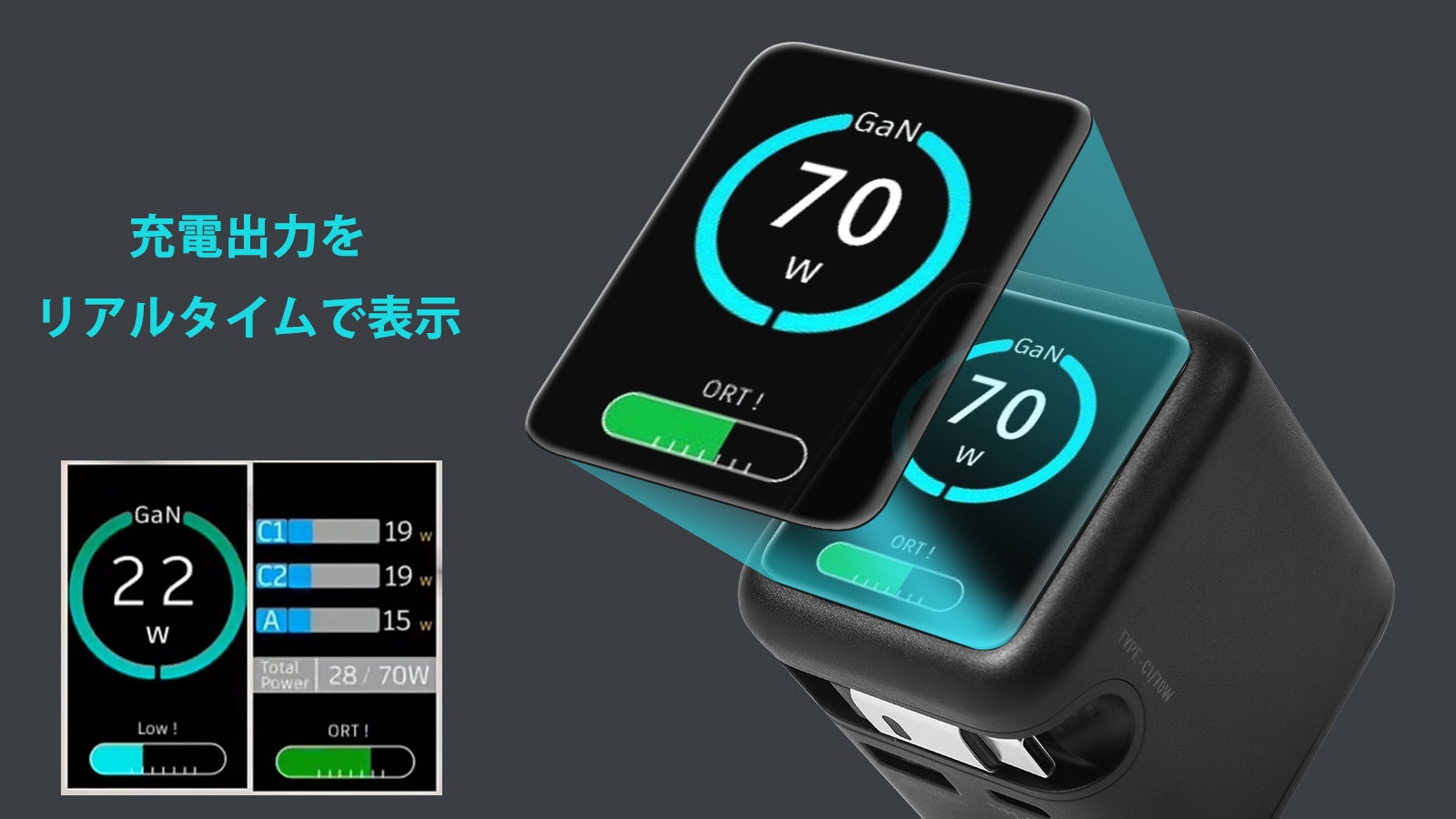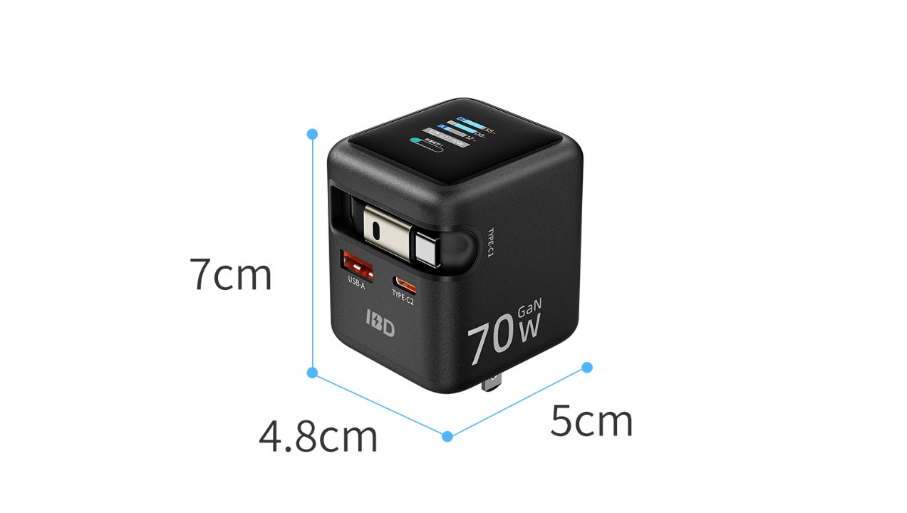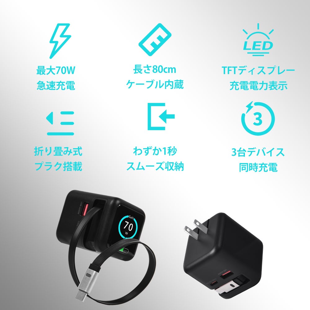 発売開始!充電の“全部入り”。出力表示付き、ケーブル内蔵のGaN 70W急速充電器