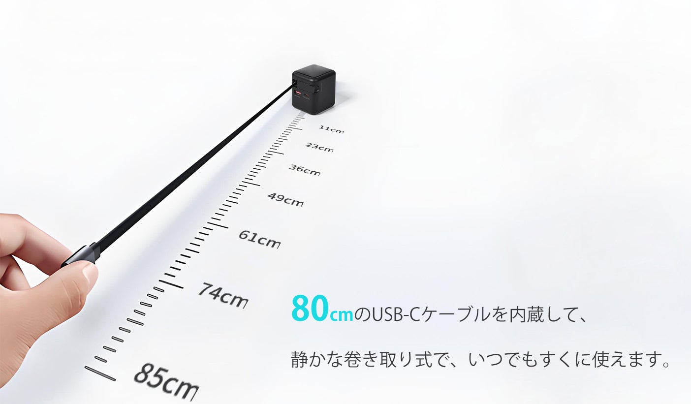 最大70Wの急速充電に対応し、コードリール式のType-Cケーブル(最長80cm)を本体に内蔵。さらにUSB-CとUSB-Aポートを搭載しているから、最大3台のデバイスを同時に充電可能。