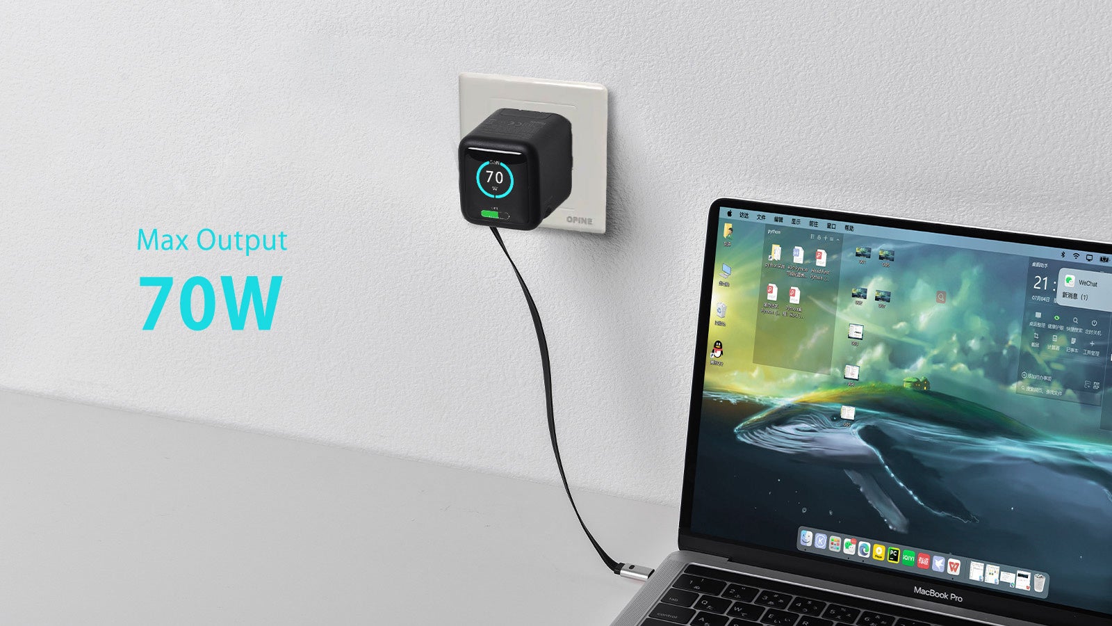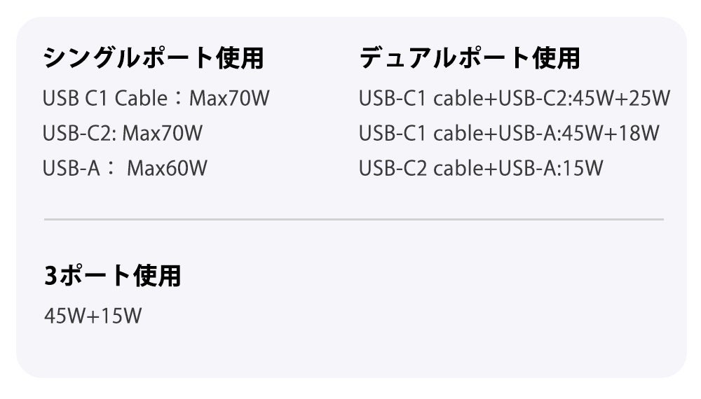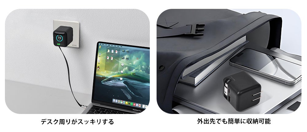 USB-Cのシングルポートで最大70W出力に対応し、ノートパソコンやタブレット、スマートフォンなど、さまざまなデバイスを高速かつ安定して充電できます。