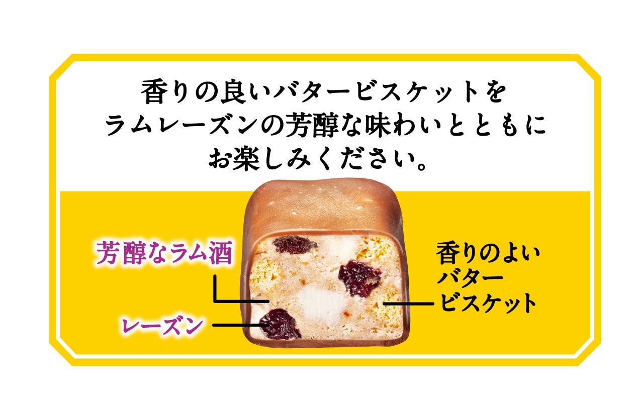 本商品は、お土産としても昨今の定番スイーツとしても人気の「レーズンバターサンド」をテーマにしたひとくちサイズのブラックサンダーです。レーズンバターサンドをイメージした少ししっとりとした食感のバタービスケットと芳醇なラムレーズンによる上品な味わいをお楽しみいただけます。