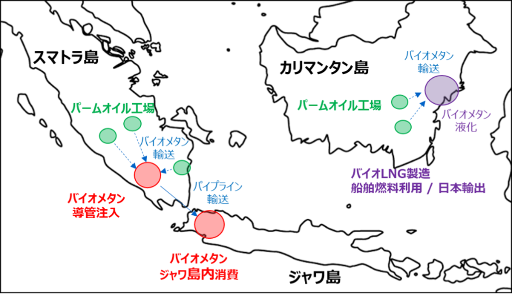 本事業は、現状POMEから大気放散されているメタンガスを回収したうえでバイオメタンとして精製し、天然ガス導管など既存インフラを利用してインドネシア国内の需要家に供給することで、メタンガスの大気放散を抑制し、さらに同国で増加する天然ガス需要に応えるとともに、化石燃料からバイオメタンへの燃料転換による需要家のCO2排出量の削減を目標としています。将来的にはスマトラ島全域、さらにカリマンタン島へと事業規模を拡大しながら、バイオメタンを液化したバイオLNGを船舶燃料として供給する事業やバイオLNGを日本などに輸出する事業の検討を実施します。
