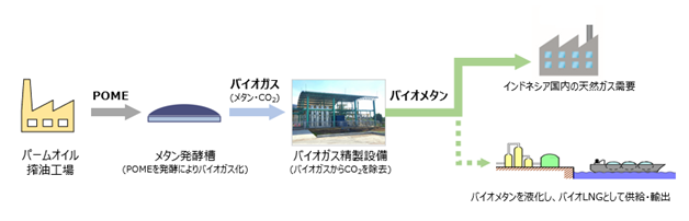 *1:POMEが嫌気性発酵することで生じるバイオガス(主成分はメタンとCO2)から精製設備でCO2を除去し、メタン純度を高めたバイオ燃料を指す。化石由来の天然ガスとほぼ同等の性質を有するため、天然ガス代替燃料として注目されている。