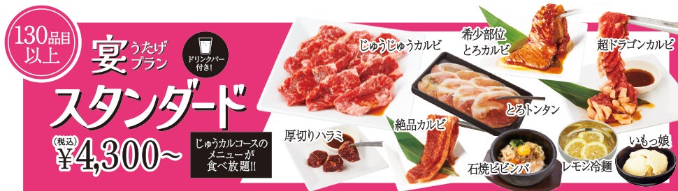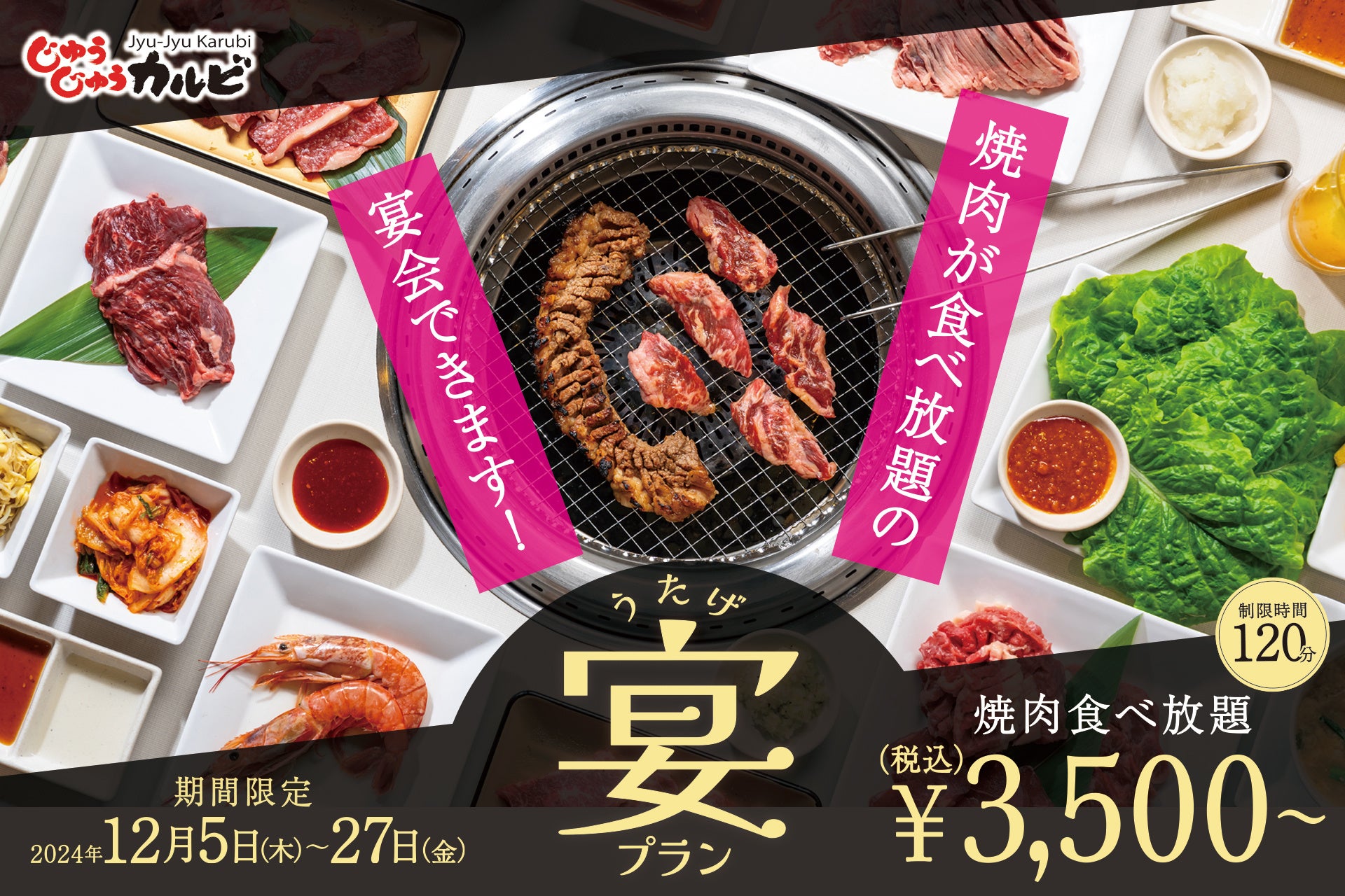 株式会社トマトアンドアソシエイツ(本社:兵庫県西宮市、代表取締役社長:小林 大二)が運営する 焼肉食べ放題「じゅうじゅうカルビ」では、2024年12月5日(木)より予約限定「宴プラン」を販売いたします。ご予約は12月1日(日)より受付開始いたします。